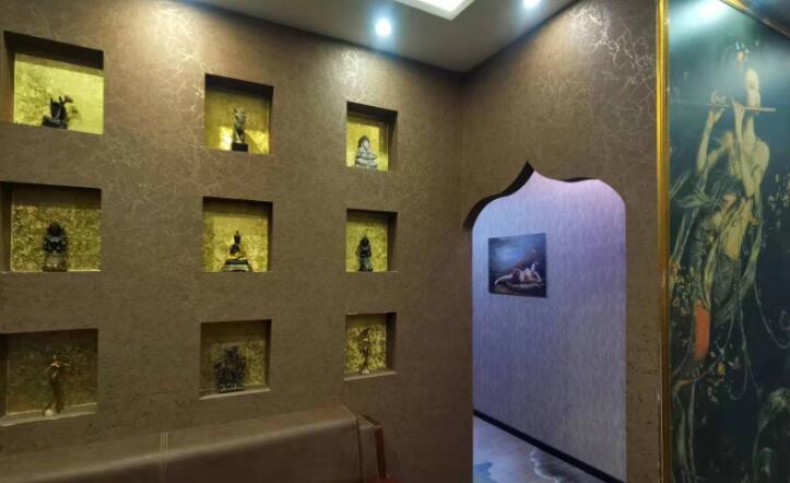 在室内装饰中,整体空间以金黄色为主色调,以唐代元素铺展。它是唐代宫廷乐舞城中唐代舞蹈的一大奇观。仙女们穿着羽毛服,在梦境中翩翩起舞,在墙上生动地跳跃着;丰满的女式墙面装饰和古色古香的仿木屏风,通过图案和结构的精心布局,再加上金色的灯光和色彩斑斓的房间,处处彰显出幽雅的气质。在精致的处理中,总有一股清风,仿佛置身于唐朝的宫廷。